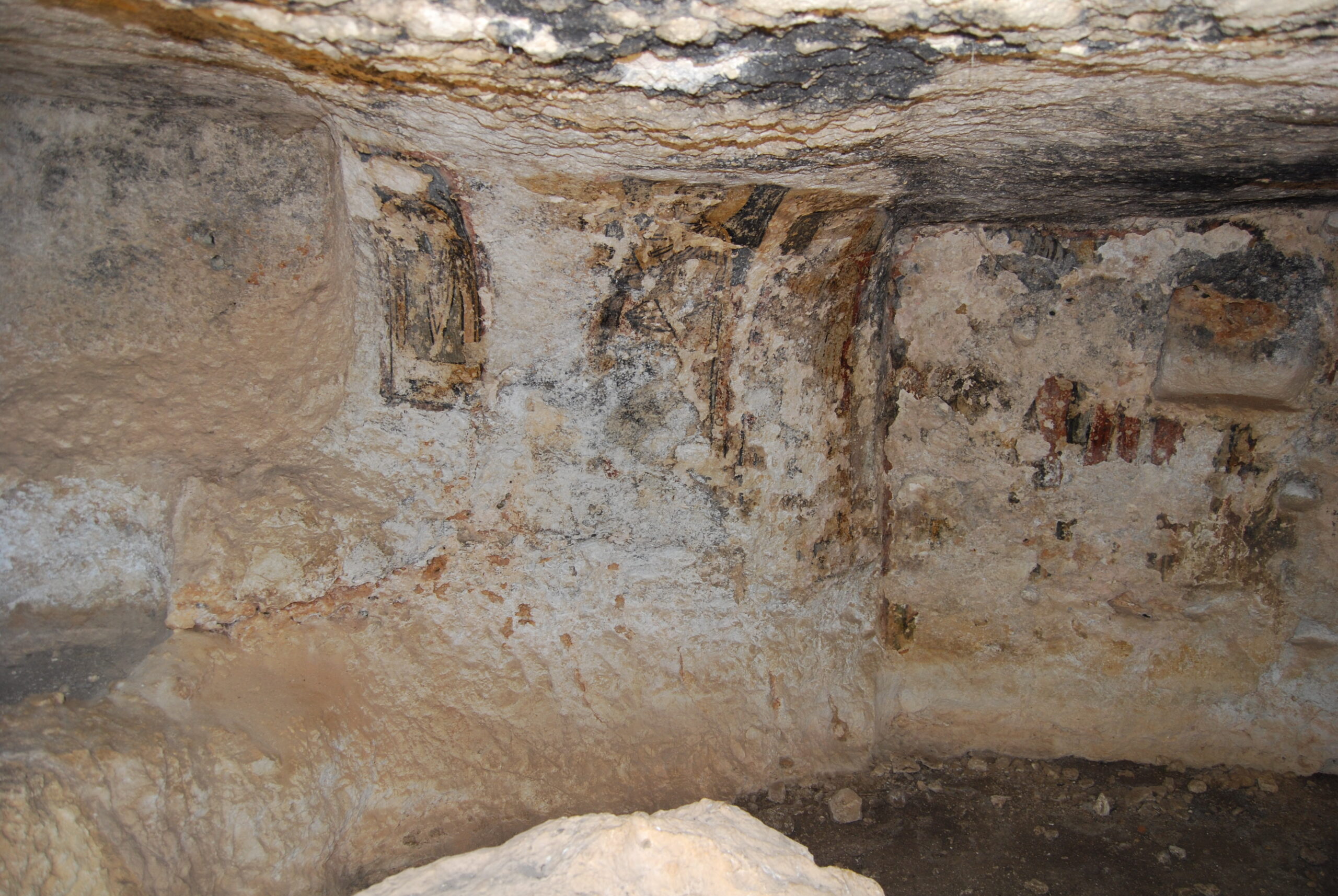 Altri minuti frammenti pittorici, illeggibili e forse pertinenti a due strati diversi affiorano nella parete nord, dove rimane, tagliata da una nicchia successiva, la parte inferiore di una figura stante. Le tracce pittoriche conservate interessano dunque l’intera parete settentrionale del vano A (ovvero il pilastro divisorio e il settore orientale della parete nord).
